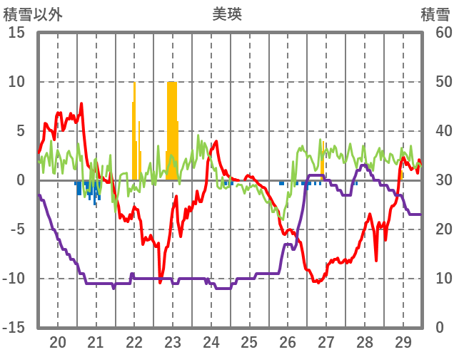 | 日 | 時 | 気温 | 降水 | 風向/風速 | 日照 | 積雪 | 降雪 |