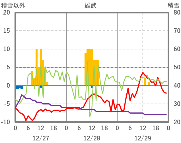 | 日 | 時 | 気温 | 降水 | 風向/風速 | 日照 | 積雪 | 降雪 |