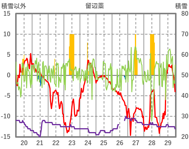 | 日 | 時 | 気温 | 降水 | 風向/風速 | 日照 | 積雪 | 降雪 |