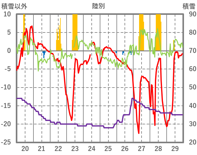 | 日 | 時 | 気温 | 降水 | 風向/風速 | 日照 | 積雪 | 降雪 |