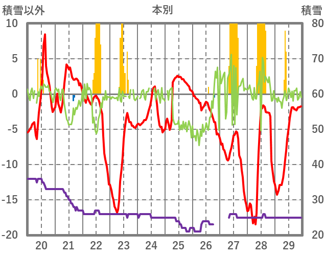 | 日 | 時 | 気温 | 降水 | 風向/風速 | 日照 | 積雪 | 降雪 |