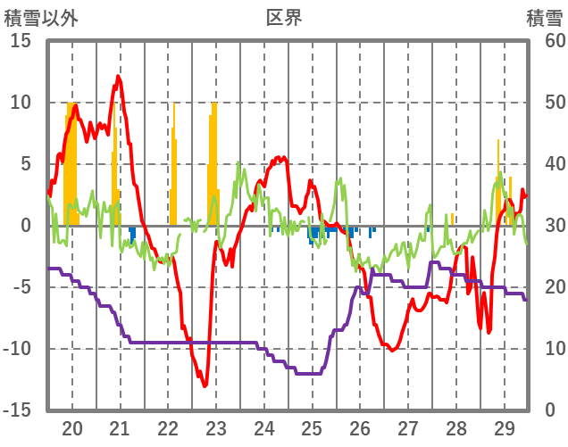 | 日 | 時 | 気温 | 降水 | 風向/風速 | 日照 | 積雪 | 降雪 |