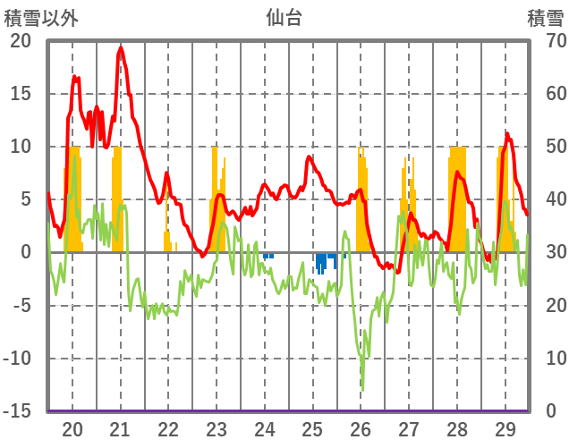 | 日 | 時 | 気温 | 降水 | 風向/風速 | 日照 | 積雪 | 降雪 |