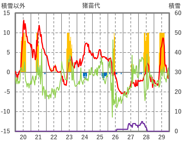 | 日 | 時 | 気温 | 降水 | 風向/風速 | 日照 | 積雪 | 降雪 |
