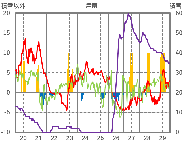 | 日 | 時 | 気温 | 降水 | 風向/風速 | 日照 | 積雪 | 降雪 |