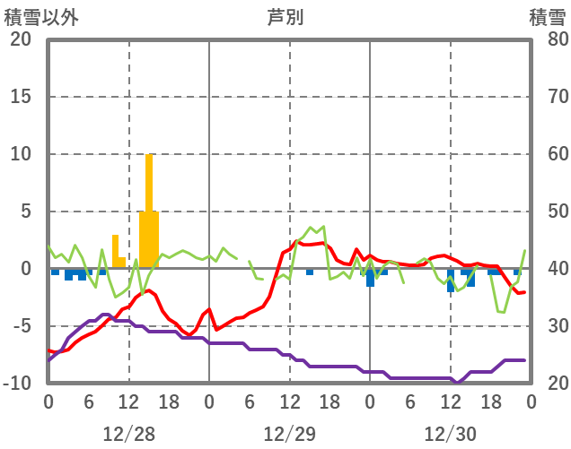 | 日 | 時 | 気温 | 降水 | 風向/風速 | 日照 | 積雪 | 降雪 |