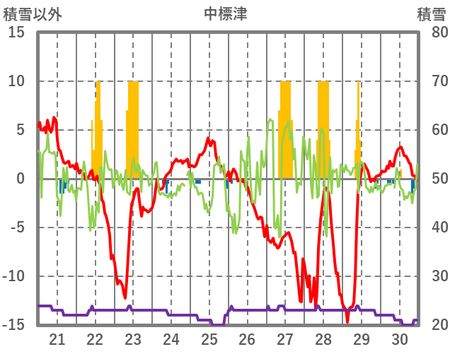 | 日 | 時 | 気温 | 降水 | 風向/風速 | 日照 | 積雪 | 降雪 |