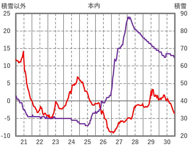 | 日 | 時 | 気温 | 降水 | 風向/風速 | 日照 | 積雪 | 降雪 |
