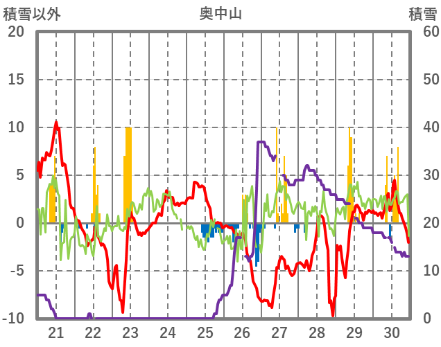 | 日 | 時 | 気温 | 降水 | 風向/風速 | 日照 | 積雪 | 降雪 |