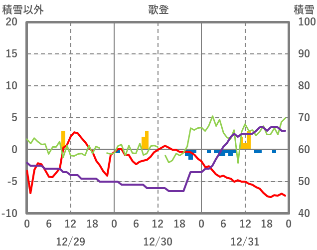 | 日 | 時 | 気温 | 降水 | 風向/風速 | 日照 | 積雪 | 降雪 |
