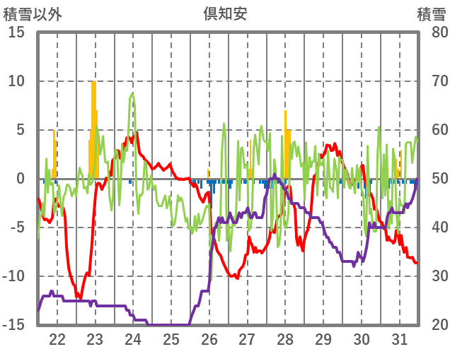 | 日 | 時 | 気温 | 降水 | 風向/風速 | 日照 | 積雪 | 降雪 |