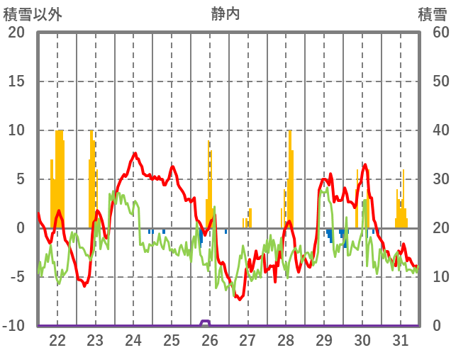 | 日 | 時 | 気温 | 降水 | 風向/風速 | 日照 | 積雪 | 降雪 |