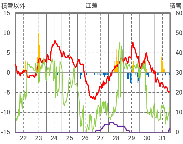 | 日 | 時 | 気温 | 降水 | 風向/風速 | 日照 | 積雪 | 降雪 |
