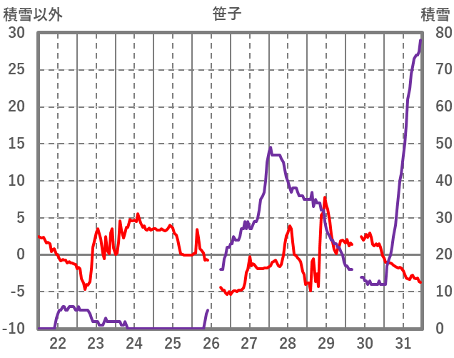 | 日 | 時 | 気温 | 降水 | 風向/風速 | 日照 | 積雪 | 降雪 |