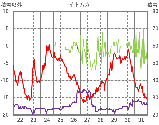 | 日 | 時 | 気温 | 降水 | 風向/風速 | 日照 | 積雪 | 降雪 |