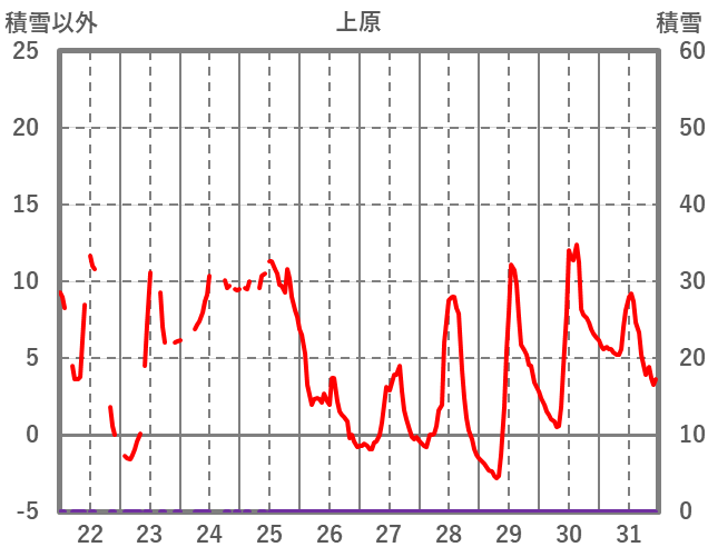 | 日 | 時 | 気温 | 降水 | 風向/風速 | 日照 | 積雪 | 降雪 |