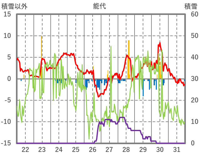 | 日 | 時 | 気温 | 降水 | 風向/風速 | 日照 | 積雪 | 降雪 |