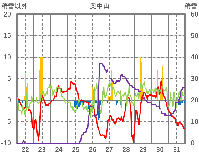 | 日 | 時 | 気温 | 降水 | 風向/風速 | 日照 | 積雪 | 降雪 |