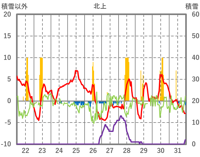 | 日 | 時 | 気温 | 降水 | 風向/風速 | 日照 | 積雪 | 降雪 |
