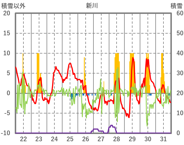| 日 | 時 | 気温 | 降水 | 風向/風速 | 日照 | 積雪 | 降雪 |