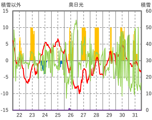 | 日 | 時 | 気温 | 降水 | 風向/風速 | 日照 | 積雪 | 降雪 |