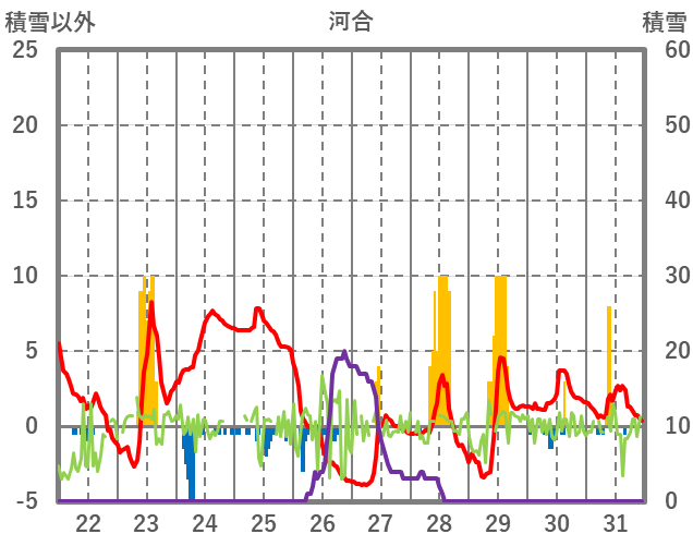 | 日 | 時 | 気温 | 降水 | 風向/風速 | 日照 | 積雪 | 降雪 |