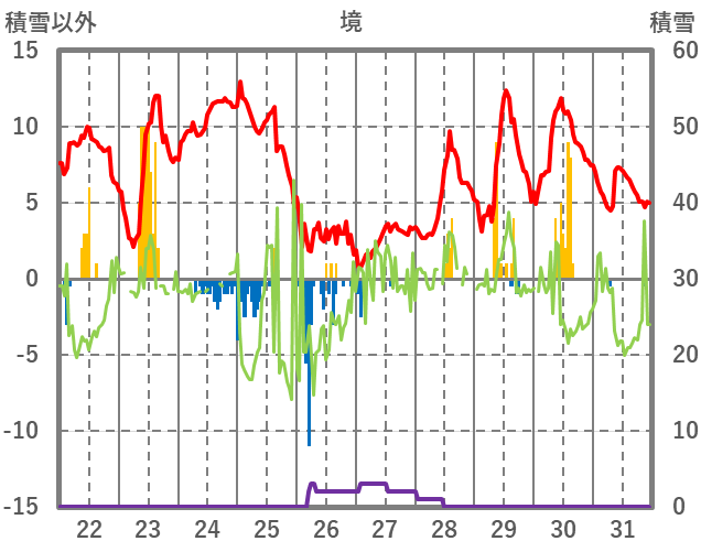 | 日 | 時 | 気温 | 降水 | 風向/風速 | 日照 | 積雪 | 降雪 |
