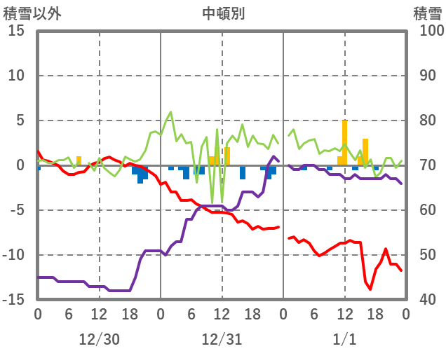 | 日 | 時 | 気温 | 降水 | 風向/風速 | 日照 | 積雪 | 降雪 |