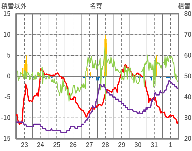 | 日 | 時 | 気温 | 降水 | 風向/風速 | 日照 | 積雪 | 降雪 |