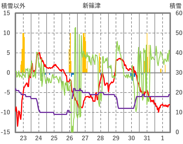 | 日 | 時 | 気温 | 降水 | 風向/風速 | 日照 | 積雪 | 降雪 |
