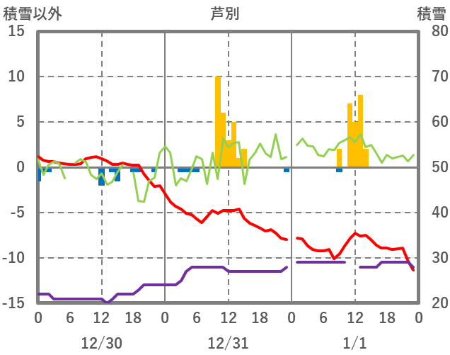 | 日 | 時 | 気温 | 降水 | 風向/風速 | 日照 | 積雪 | 降雪 |