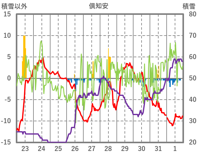 | 日 | 時 | 気温 | 降水 | 風向/風速 | 日照 | 積雪 | 降雪 |