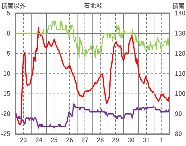 | 日 | 時 | 気温 | 降水 | 風向/風速 | 日照 | 積雪 | 降雪 |