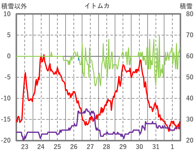 | 日 | 時 | 気温 | 降水 | 風向/風速 | 日照 | 積雪 | 降雪 |