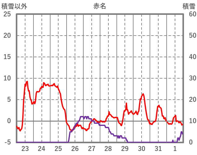 | 日 | 時 | 気温 | 降水 | 風向/風速 | 日照 | 積雪 | 降雪 |