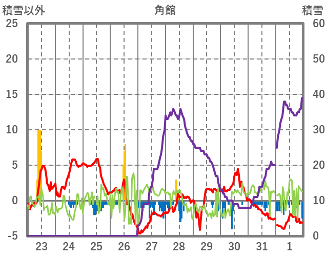 | 日 | 時 | 気温 | 降水 | 風向/風速 | 日照 | 積雪 | 降雪 |