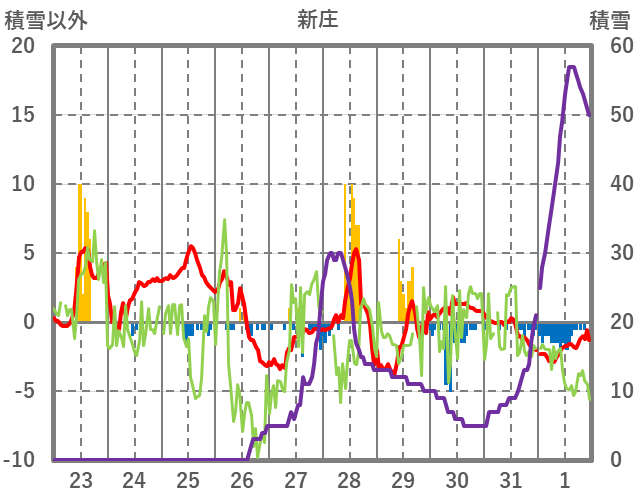| 日 | 時 | 気温 | 降水 | 風向/風速 | 日照 | 積雪 | 降雪 |