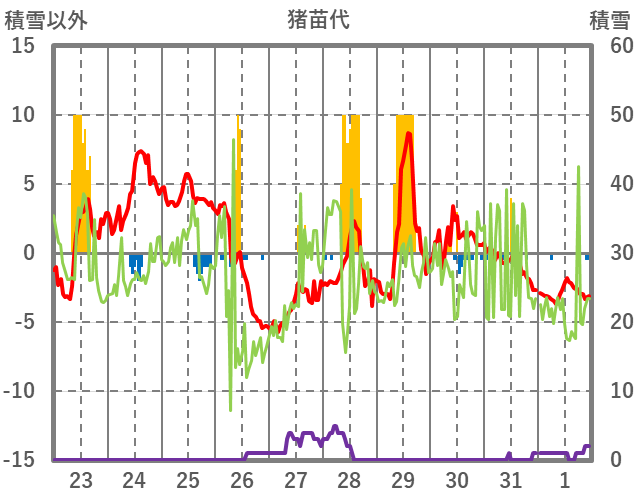 | 日 | 時 | 気温 | 降水 | 風向/風速 | 日照 | 積雪 | 降雪 |
