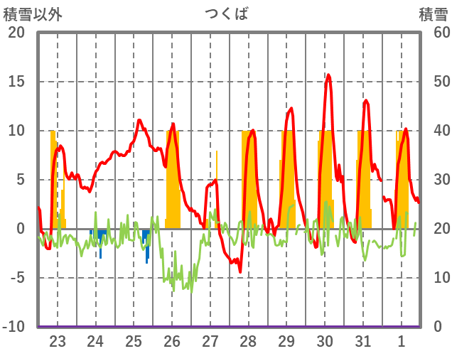 | 日 | 時 | 気温 | 降水 | 風向/風速 | 日照 | 積雪 | 降雪 |