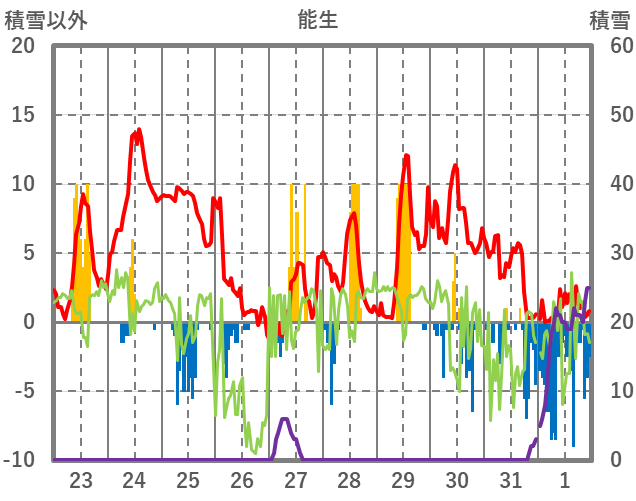 | 日 | 時 | 気温 | 降水 | 風向/風速 | 日照 | 積雪 | 降雪 |