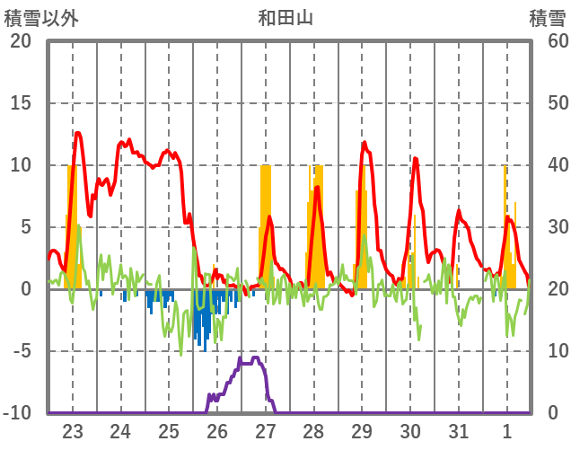 | 日 | 時 | 気温 | 降水 | 風向/風速 | 日照 | 積雪 | 降雪 |