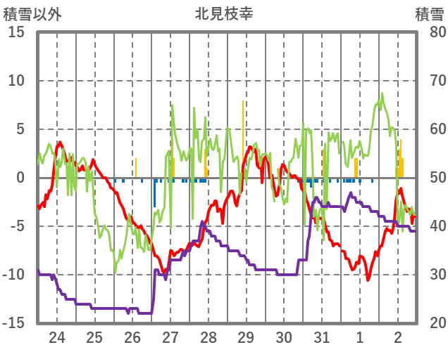 | 日 | 時 | 気温 | 降水 | 風向/風速 | 日照 | 積雪 | 降雪 |