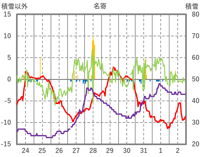 | 日 | 時 | 気温 | 降水 | 風向/風速 | 日照 | 積雪 | 降雪 |
