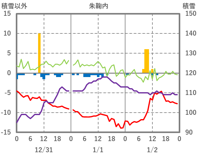 | 日 | 時 | 気温 | 降水 | 風向/風速 | 日照 | 積雪 | 降雪 |