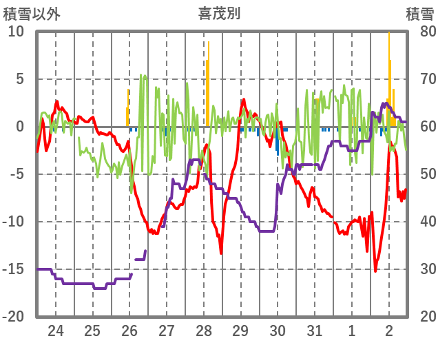 | 日 | 時 | 気温 | 降水 | 風向/風速 | 日照 | 積雪 | 降雪 |
