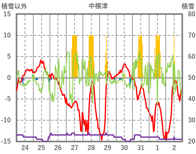 | 日 | 時 | 気温 | 降水 | 風向/風速 | 日照 | 積雪 | 降雪 |