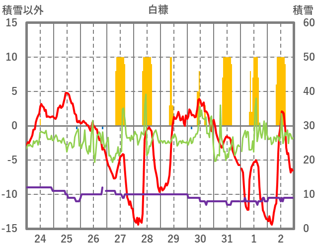 | 日 | 時 | 気温 | 降水 | 風向/風速 | 日照 | 積雪 | 降雪 |