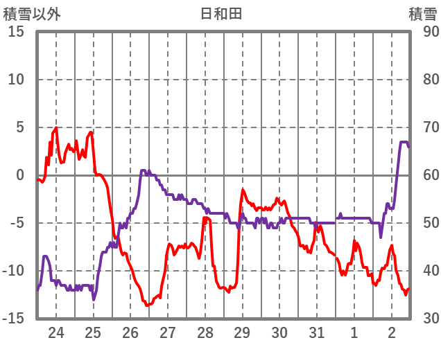 | 日 | 時 | 気温 | 降水 | 風向/風速 | 日照 | 積雪 | 降雪 |