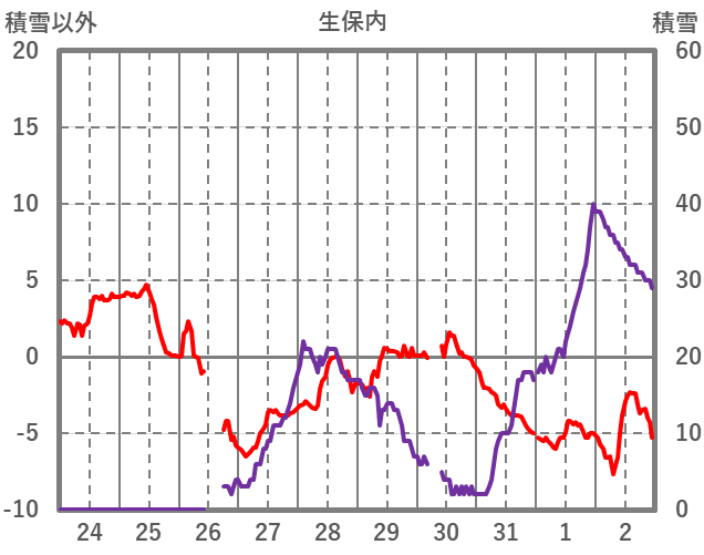 | 日 | 時 | 気温 | 降水 | 風向/風速 | 日照 | 積雪 | 降雪 |