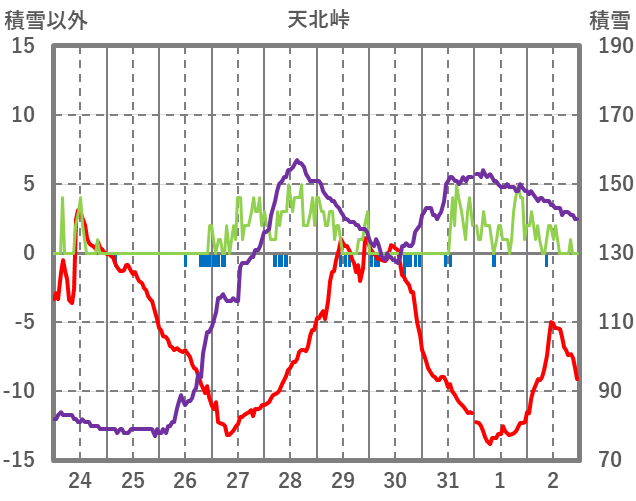 | 日 | 時 | 気温 | 降水 | 風向/風速 | 日照 | 積雪 | 降雪 |